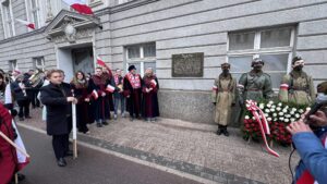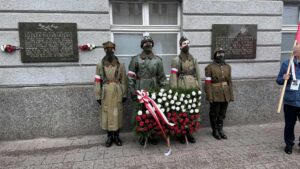 ➡️ Złożono kwiaty przy pamiątkowych tablicach na historycznym budynku Komendy Miejskiej Policji.