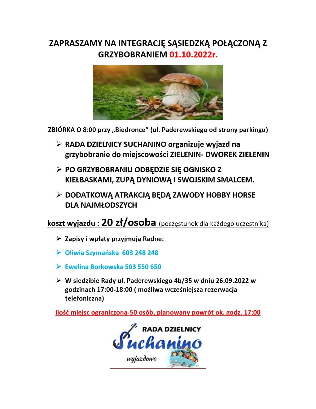 Drodzy Mieszkańcy, już 01.10.2022 zapraszamy na grzybobranie wraz z integracją sąsiedzką- zapisy zgodnie z plakatem- do zobaczenia! 🙋♂️