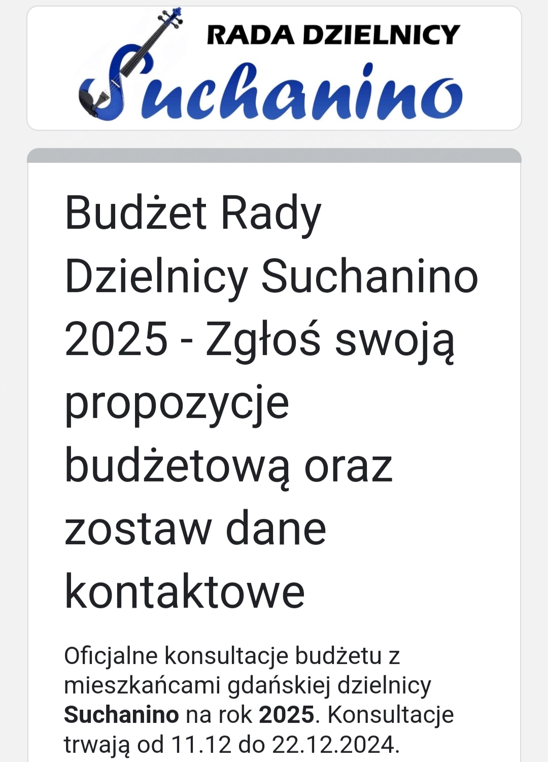 Rozpoczynamy konsultacje budżetu dzielnicy Suchanino na 2025r. Propozycje na działania infrastrukturalne i społeczne można składać do 22.12.2024r (niedziela) za pośrednictwem