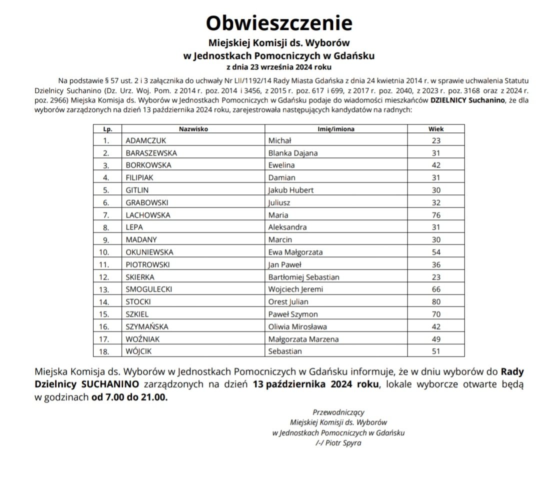 Obwieszczenie Miejskiej Komisji ds. Wyborów w Jednostkach Pomocniczych w Gdańsku. Wybory do Rady Dzielnicy #Suchanino odbędą się 13 października 2024 roku, lokale wyborcze otwarte będą w godzinach 7-21:00.
