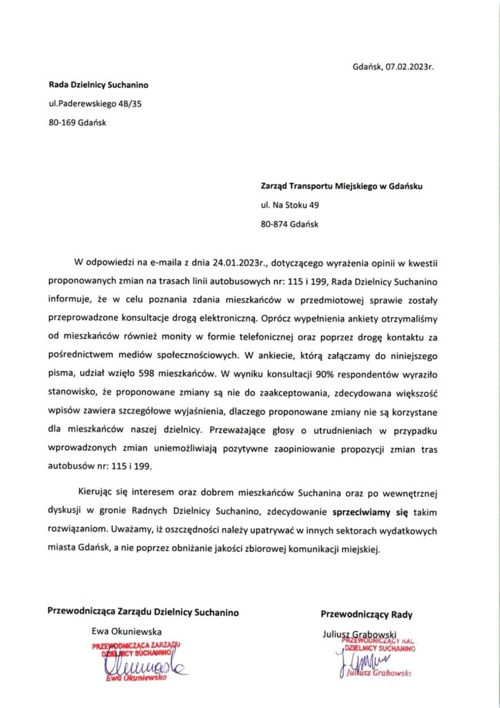 Oficjalne stanowisko Rady Dzielnicy Suchanino w sprawie propozycji ZTM w Gdańsku(autobusy nr 115,199).