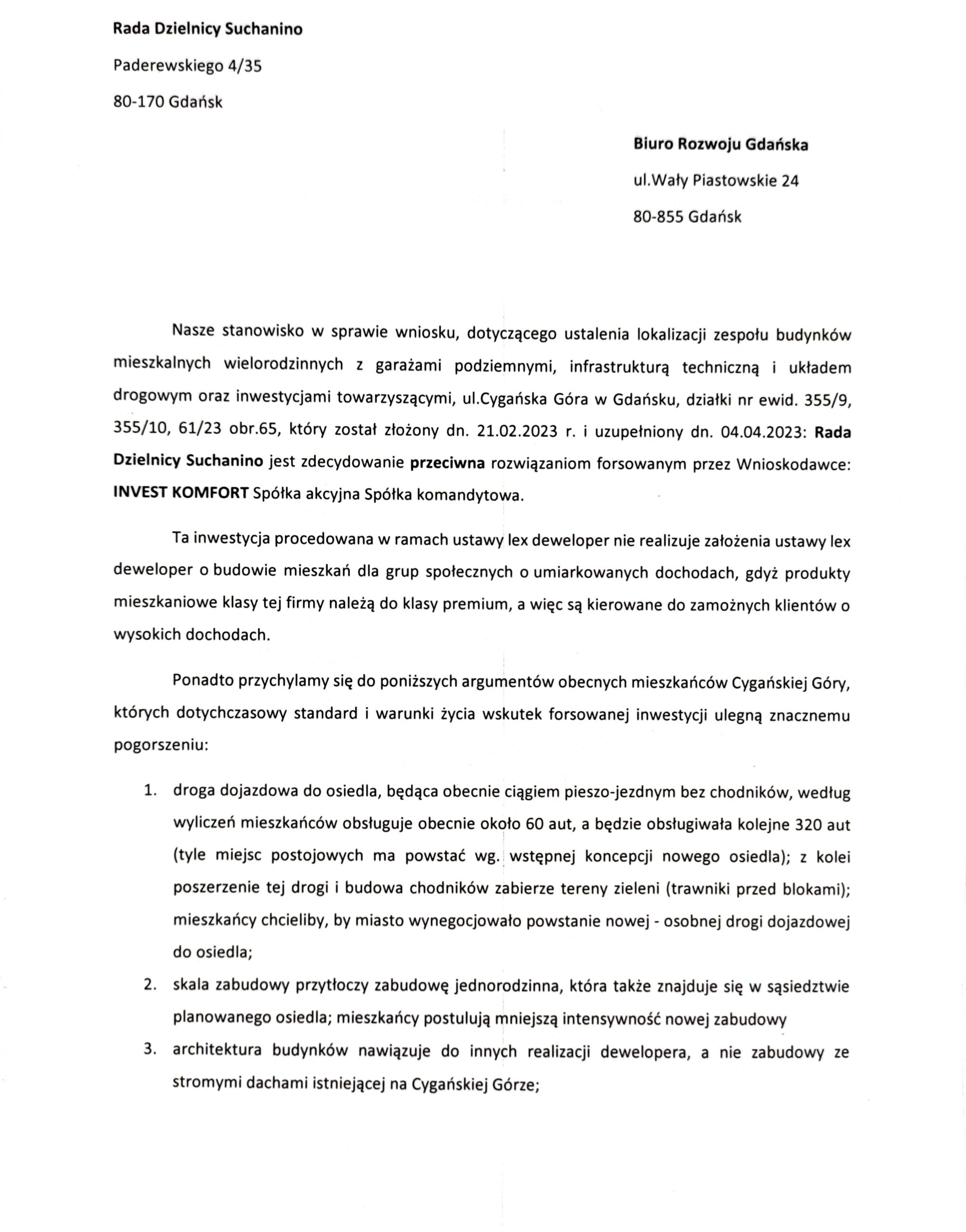 Rada Dzielnicy Suchanino wyraża sprzeciw wobec inwestycji Invest Komfort przy ulicy Cygańska Góra. Jest ona forsowana w trybie specustawy „lex deweloper”.