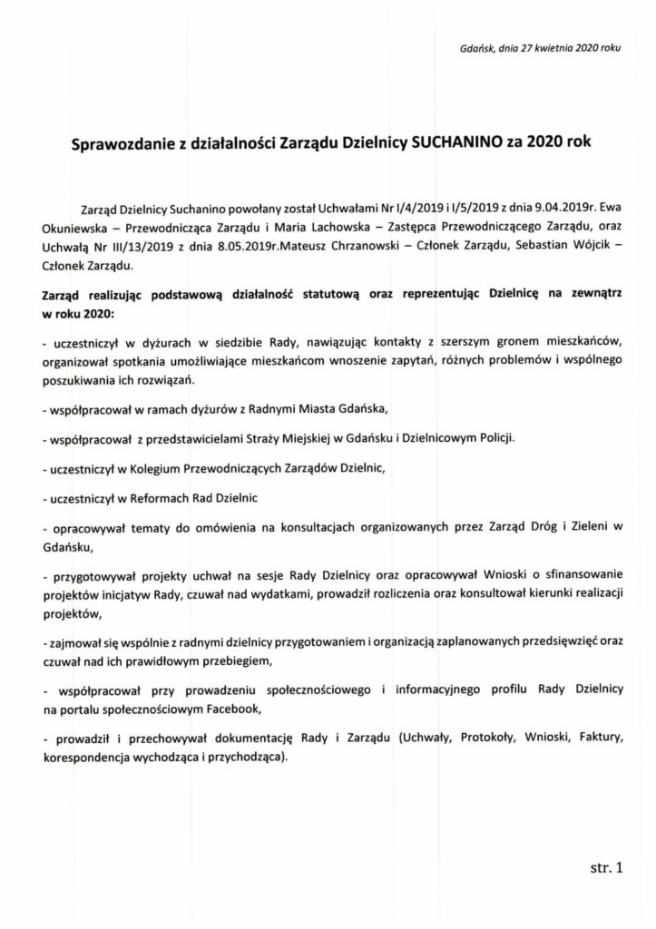 Sprawozdanie Zarządu Dzielnicy Suchanino z działalności za rok 2020.