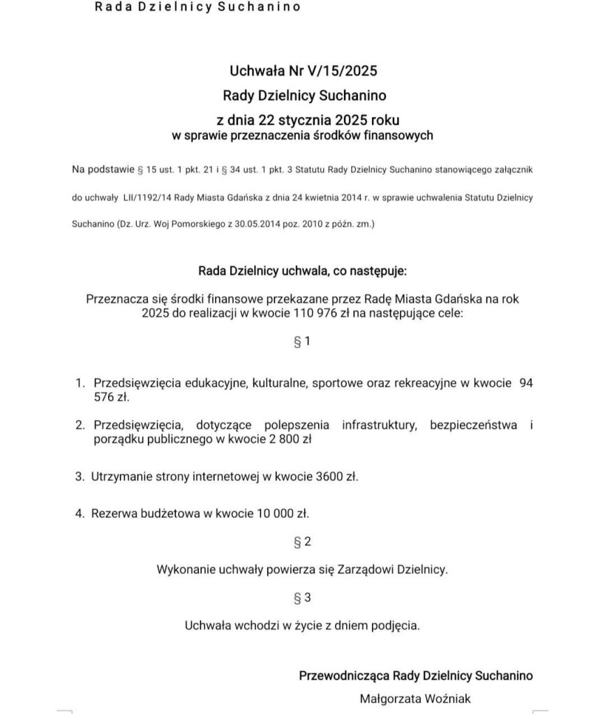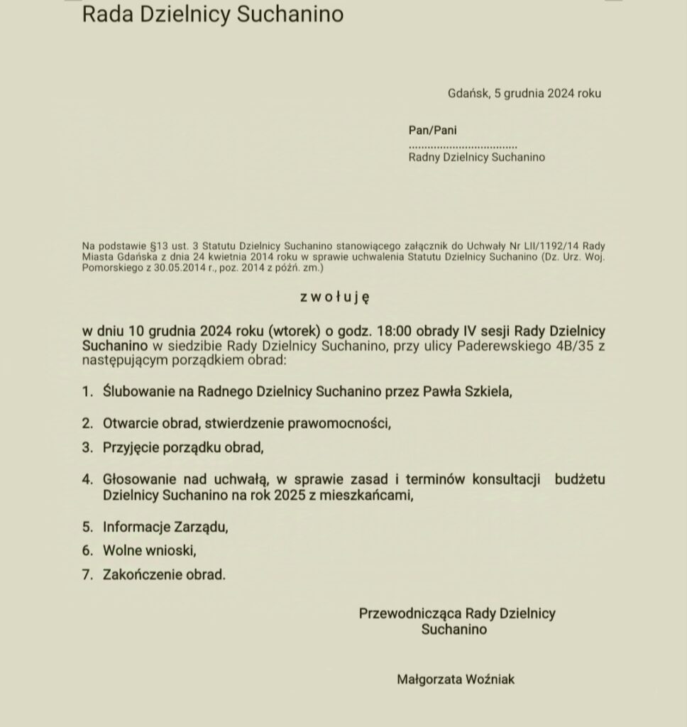 Przed nami V Sesja Rady Dzielnicy Suchanino, która odbędzie się dn. 22.01.2024, o godz. 18:30.Podczas Sesji poddamy pod głosowanie Uchwałę Budżetową oraz rozszerzymy skład osobowy Komisji Stałych Rady Dzielnicy Suchanino.